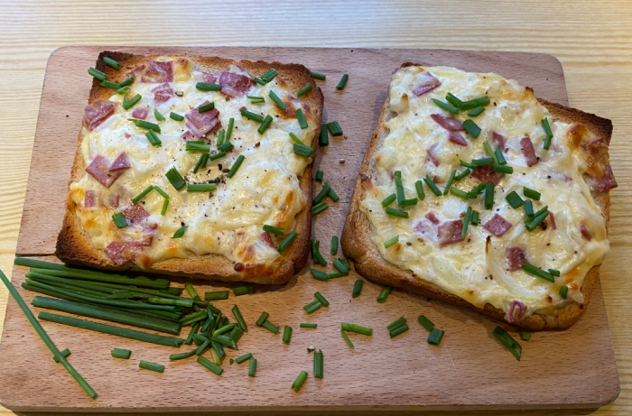 - Zum Schluss die Masse auf die Toast-Scheiben geben und das Ganze für 10 Minuten in den Ofen geben. Am Besten schmeckt der Flammkuchen mit Schnittlauch garniert frisch aus dem Ofen.