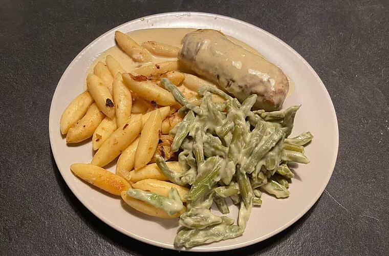 "Einfach mal was Neues probieren!" - Das haben wir uns diesmal gedacht und statt klassischer Rouladen welche aus Schnitzel, Schinken und Parmesankäse gezaubert. Das Ergebnis lässt sich sehen - und schmecken! Dazu gab es eine leckere Weißwein-Rahm-Soße, sowie Schupfnudeln und Bohnengemüse. Wir können uns aber auch Knödel und einen gemischten Salat gut dazu vorstellen!