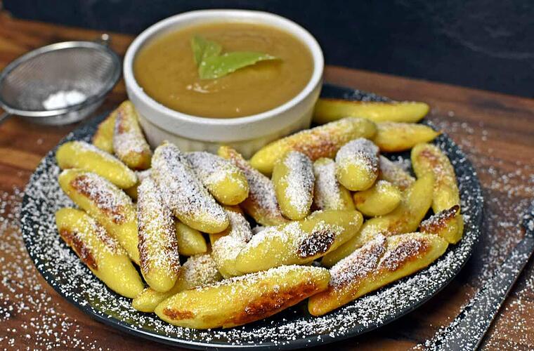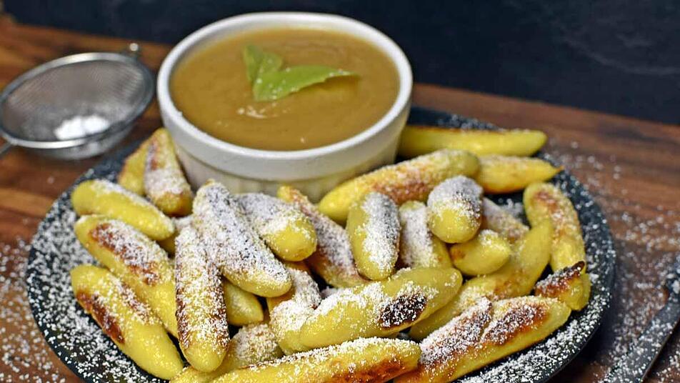 - Bestäube deine Hände mit etwas Mehl, und forme etwa fingergroße Rollen aus dem Kartoffelteig. Diese brätst du bei mittlerer Hitze in Butterschmalz an, bis sie eine goldbraune Farbe annehmen.