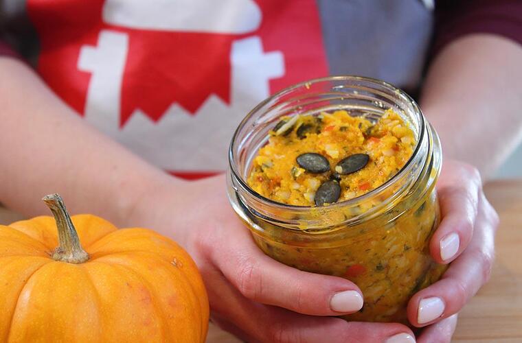 Herbst und Kürbis gehören in Franken einfach zusammen. Unser Feuriges Kürbis Pesto mit Parmesan ist im Handumdrehen gezaubert und ist vielseitig einsetzbar: Es passt zu Nudeln, als Aufstrich auf's Brot oder zum Marinieren von Fleisch. Im Kühlschrank hält es sich ein paar Tage, oder man friert es einfach portionsweise ein.