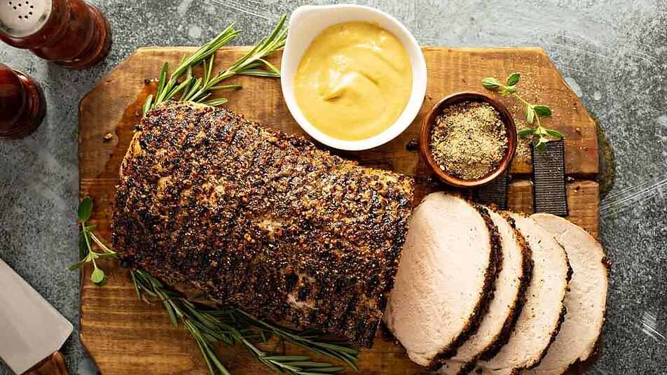 - Als Erstes den Braten mit Salz und Pfeffer einreiben und dick mit Senf bestreichen.