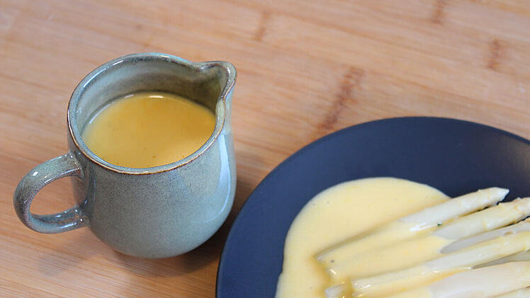 Eigelb mit einem Esslöffel kaltem Wasser, sowie dem Weißwein und dem Zitronensaft mit in eine Edelstahlschüssel geben und alles verrühren. Alles über einem heißen Wasserbad mit einem Schneebesen oder einem Handmixer aufschlagen, bis eine dickliche Creme entsteht. Die Sauce vom Wasserbad nehmen und eine halbe Minute weiterschlagen.