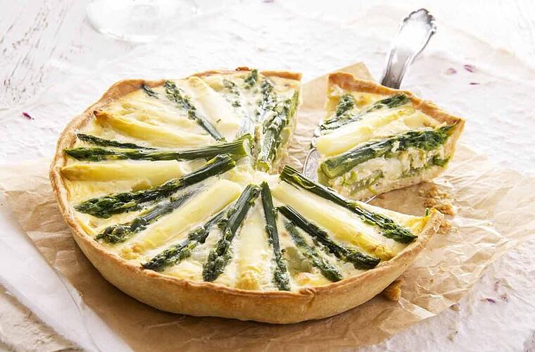 - In der Zwischenzeit Schmand, Eier und Parmesan verquirlen. Mit Salz und Pfeffer würzen. Die Spargelstangen kreisförmig auf dem Teigboden verteilen und mit der flüssigen Masse begießen. Die Quiche ca. 35 Minuten auf der untersten Schiene goldbraun backen.