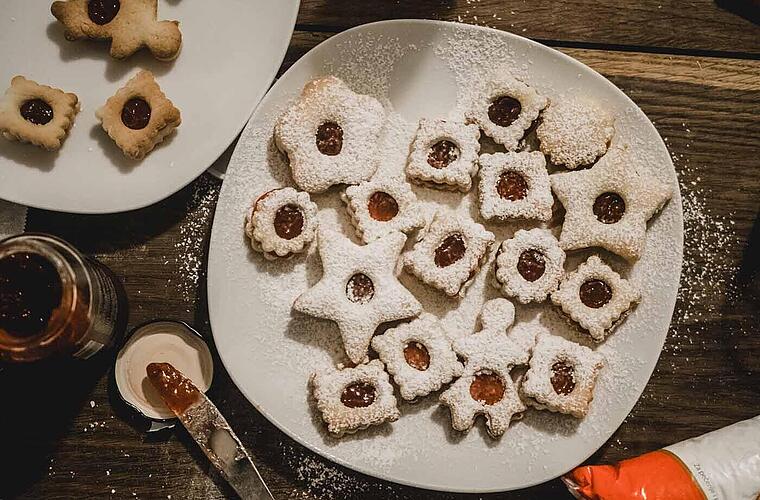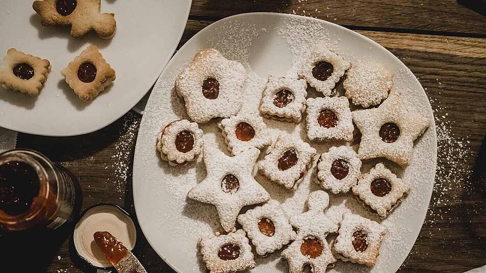 - Glühweingelee mit einem Schneebesen verrühren und in einen Spritzbeutel füllen. Etwas Gelee auf die Rückseite der geschlossenen Sterne spritzen, Sterne mit Loch daraufsetzen und andrücken.