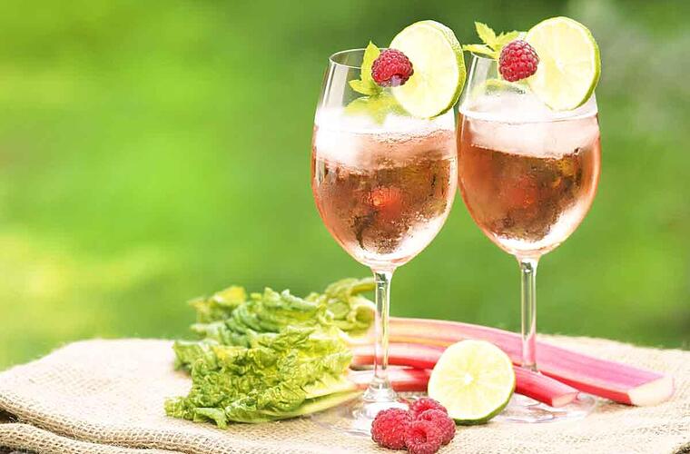 - Zum Garnieren einen Streifen Rhabarber oder eine Scheibe Limette und ein paar Blätter Minze in die Gläser geben.