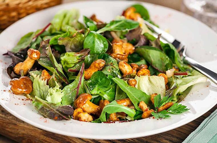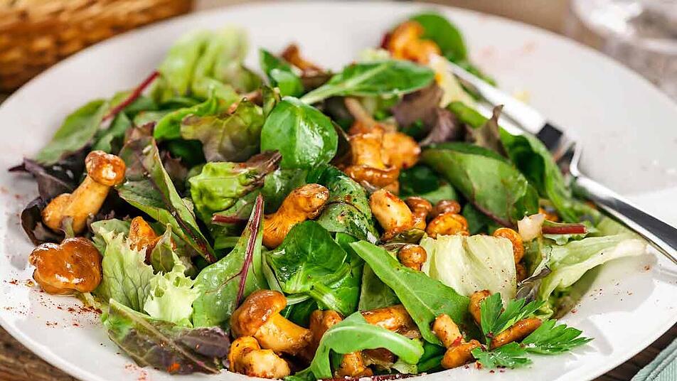Der warme Pfifferlingsalat ist eine echte Spezialität aus dem Steigerwald. Er passt am besten zu Schweinemedaillons, oder den nächsten Sonntagsbraten. Die leckeren Pilze sind eine willkommene Abwechslung unter den Beilagen.