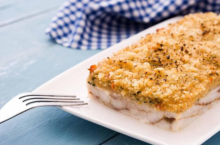 - Eine Auflaufform einfetten und mit einer Schicht des entgräteten Stockfischs beginnen. Diese Schicht leicht salzen und pfeffern. Darauf eine Schicht der Speck-Zwiebel-Brötchen-Mischung geben. Die Schichten abwechselnd wiederholen, bis alle Zutaten verbraucht sind. Die oberste Schicht sollte aus der Speck-Zwiebel-Brötchen-Mischung bestehen.