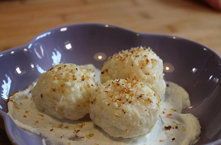 - Nach 15 Minuten die Klöße aus dem Wasser nehmen und nach Belieben anrichten.