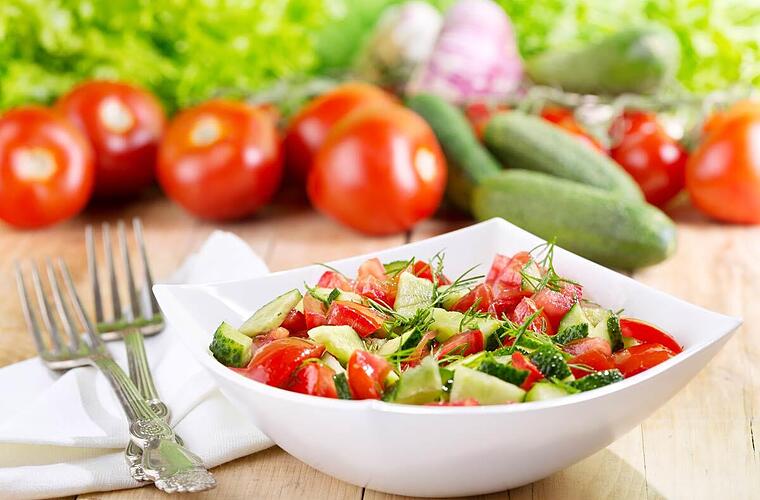 - Den Tomaten-Gurken-Salat in der Salatschüssel gut mit dem Dressing vermischen und das Ganze etwa 30 Minuten ziehen lassen.