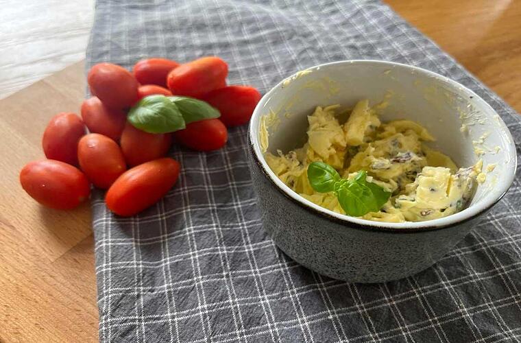 - Dann das Basilikum und die Tomaten zusammen mit Salz, Pfeffer und dem Knoblauchpulver zu der weichen Butter geben und alles mit einer Gabel vermengen.