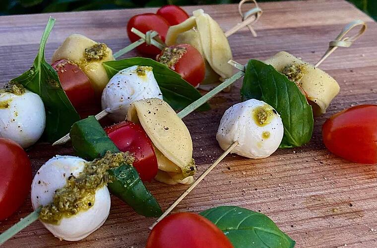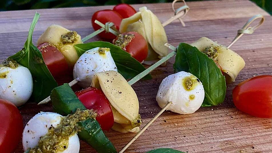 - Jetzt werden alle Zutaten nacheinander auf den Spieß gesteckt. Tortellini, Mozzarella, Basilikumblatt und Tomate ergeben einen Spieß.