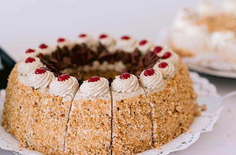 - Zuletzt die Torte außen mit Krokant bestreuen, die obere Seite jedoch frei lassen. Hier werden jetzt mit dem Spritzbeutel kleine Röschen draufgesetzt, die mit einer Kirsche verziert werden. Wer mag, kann den Kranz außerdem mit Schokoraspeln dekorieren.