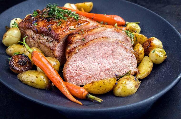 - Den Backofen auf 150° C Grad vorheizen. Das Fleisch mit dem Speck umwickeln und in einen Bräter geben. Die Butter schmelzen, dann über das Fleisch gießen. Die Gemüsewürfel um das Fleisch herum verteilen und den Kalbsfond angießen. Im Ofen für 2-3 Stunden schmoren.
