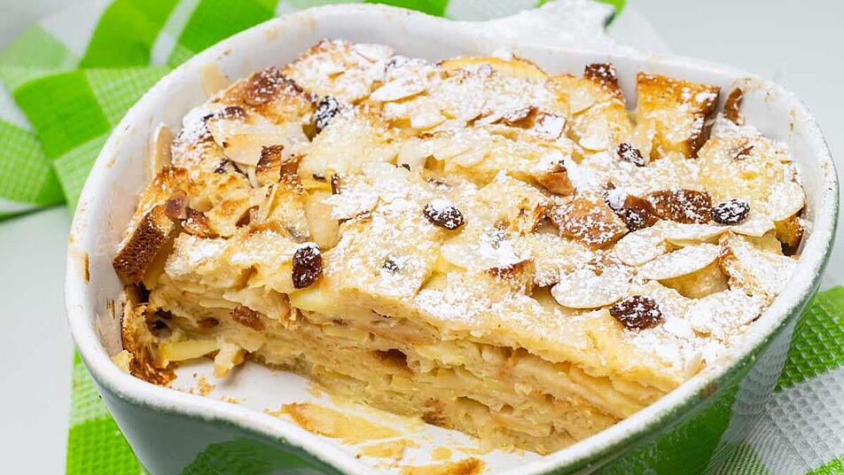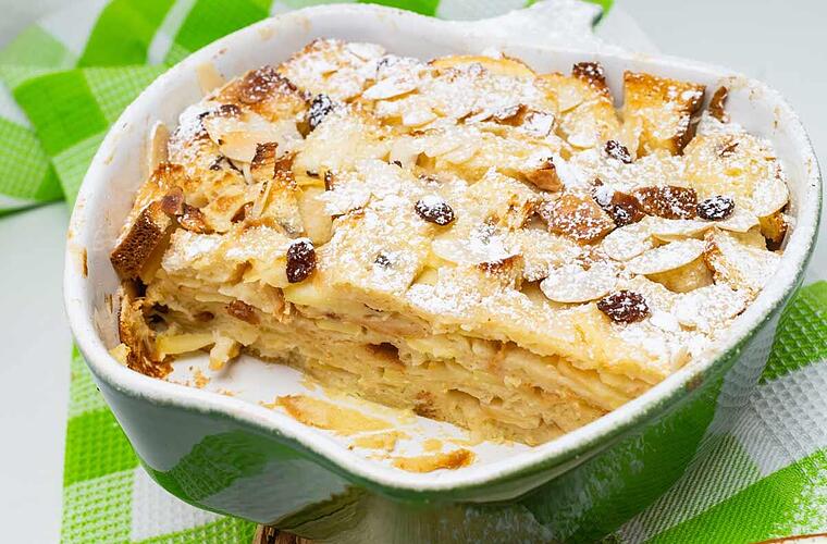 - Für die Eiermilch werden ein halber Liter Milch, vier Eier der Größe M, achtzig Gramm Zucker, ein Päckchen Bourbon Vanille Zucker und eine Prise Salz miteinander verrührt. Etwa 250 Gramm altbackene Semmeln werden blättrig geschnitten und in die Eiermilch getunkt. Eine befettete Auflaufform wird nun abwechselnd mit der Apfelmischung und den getunkten Semmeln geschichtet. Die restliche Eiermilch wird gleichmäßig darüber gegossen.