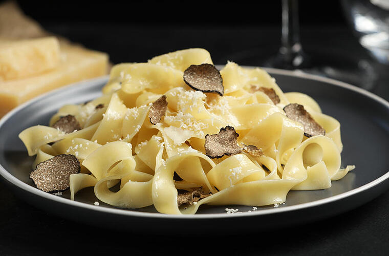- Jetzt die fertig gekochte Pasta in die Soße geben, miteinander vermengen und dann portionsweise auf Teller geben. Mit Parmesan bestreuen und mit einem Trüffelhobel den Trüffel in Scheiben hobeln und darübergeben.
