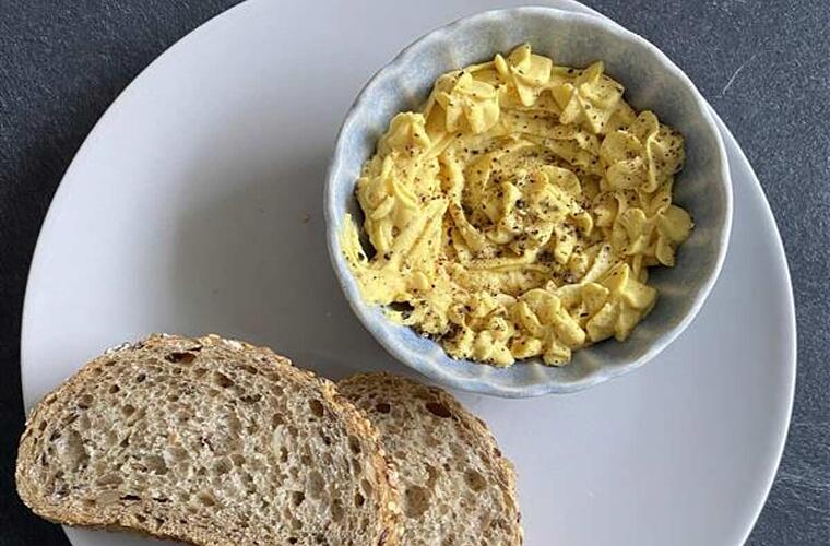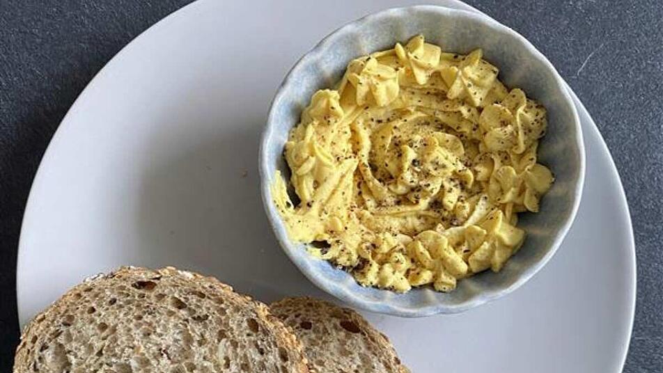 - Weiche Butter, Crème fraîche, Senf, Salz und Kurkuma zu den Eigelben geben.