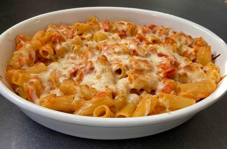 - Die Tomaten-Nudel-Käse-Masse in die Auflaufform geben, in den Backofen schieben und für 10 Minuten darin backen.