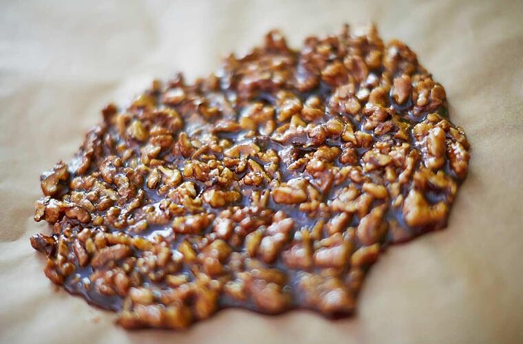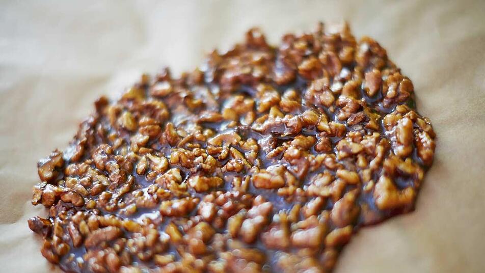- Abschließend die Walnüsse zum Abkühlen auf einem Blech flach ausstreichen, damit sich der Krokant später gut teilen lässt.