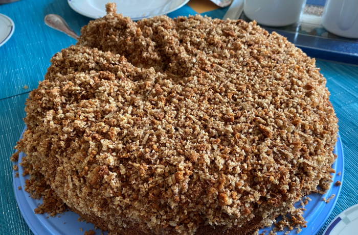 - Anschließend den oberen Boden zerkrümeln und die Torte damit bestreuen.