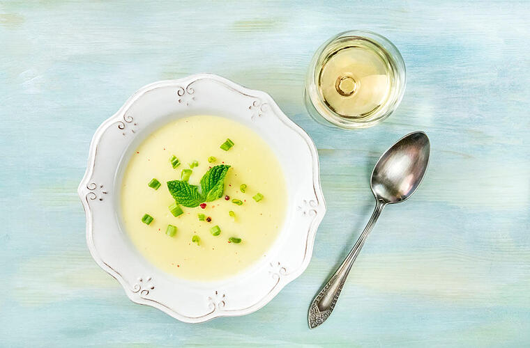 - Nun werden Sahne, Weißwein und Gemüsefond unter ständigem Rühren zugegeben. Lorbeerblatt und Pfefferkörner kommen ebenfalls dazu. Die Suppe wird bei mittlerer Hitze offen etwa 20–25 Minuten gekocht, bis das Gemüse weich ist und die Aromen sich gut verbunden haben.