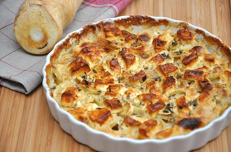 - Das Pastinaken-Gratin etwa 45-50 Minuten backen, bis das Gemüse weich und die Kruste goldbraun. Vor dem Servieren 5-10 Minuten ruhen lassen.