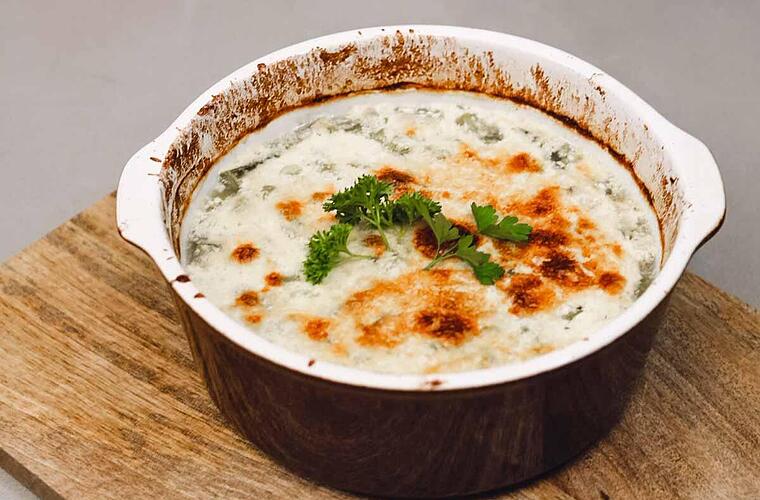 - Eine Auflaufform mit Butter ausstreichen und die Spargelmasse einfüllen. Anschließend mit dem übrigen Käse bestreuen und für 10 Minuten bei 180°C überbacken.
