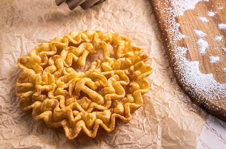 Für die zarten Rosenküchla, die fast ein wenig wie ein knuspriger Pfannkuchen schmecken, brauchst du auf jeden Fall ein spezielles Eisen. Die Rosenküchleform kann man aber mittlerweile zum Glück wieder online bestellen, wenn du kein Erbstück von deiner Oma oder Ähnliches zu Hause hast! Das Rezept ist schnell gemacht und optisch ein echtes Highlight.