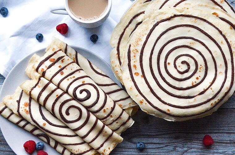 - Eine Pfanne einfetten, den hellen Teig gleichmäßig verteilen und mit der Dripflasche den dunklen Teig spiralförmig darauf verteilen. Pfannkuchen beidseitig goldbraun anbraten und so fortfahren, bis der Teig aufgebraucht ist.