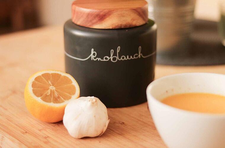 - Die Zitrone auspressen und Zitronensaft und Schalenabrieb zur Butter geben. Auch den Knoblauch auspressen oder kleinschneiden und ebenfalls zur Butter geben.