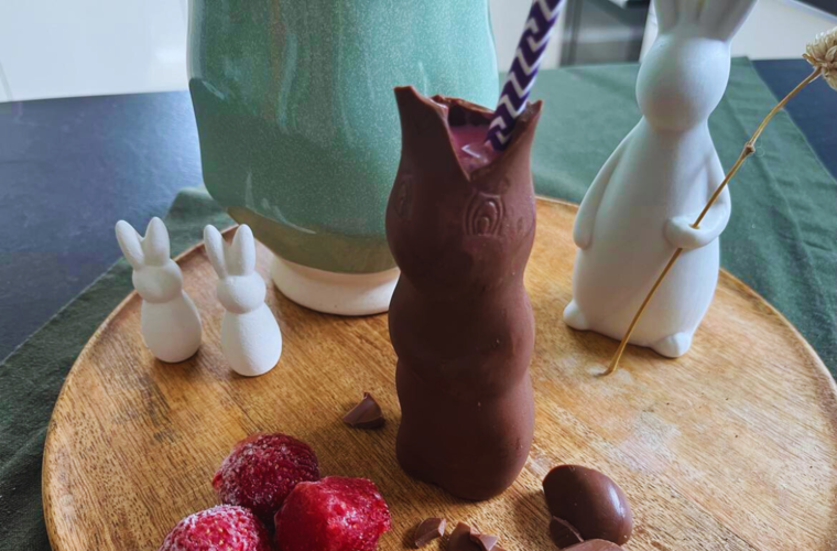 - Fülle die Erdbeermilch dann in einen sauberen Schokohasen, dem du vorher vorsichtig die Ohren entfernst. Strohhalm mit rein und optional mit frischen Beeren oder einem Blatt Minze dekorieren - und fertig!