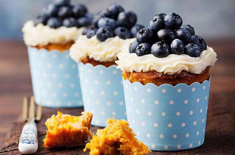 - Das Frosting mit einem Spritzbeutel oder alternativ einem Löffel auf den Muffins verteilen und mit Beeren dekorieren.