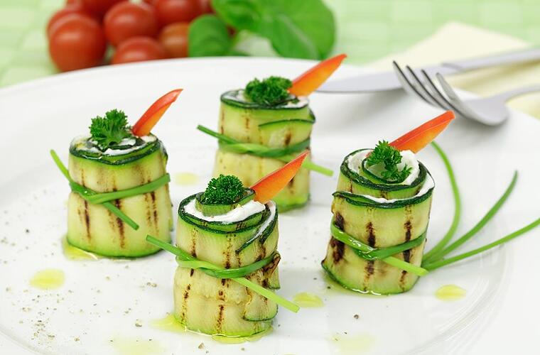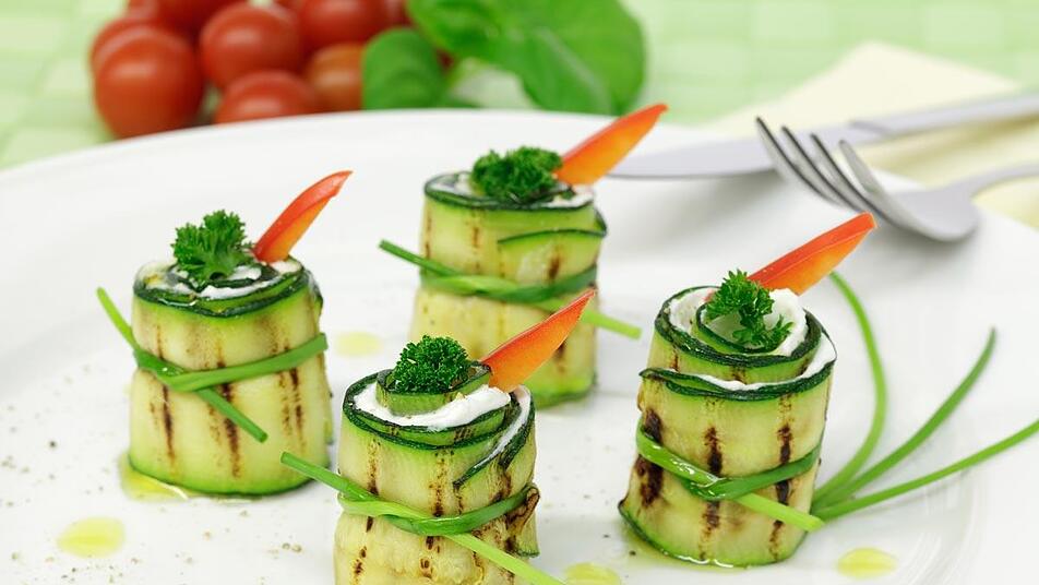 - Nun die gesamte Fläche einer Zucchinischeibe dünn mit der Quarkfüllung bestreichen. Anschließend von einer Seite aus aufrollen. Die Röllchen mit einem Stiel Schnittlauch fixieren, indem sie in der Mitte zusammengebunden werden.