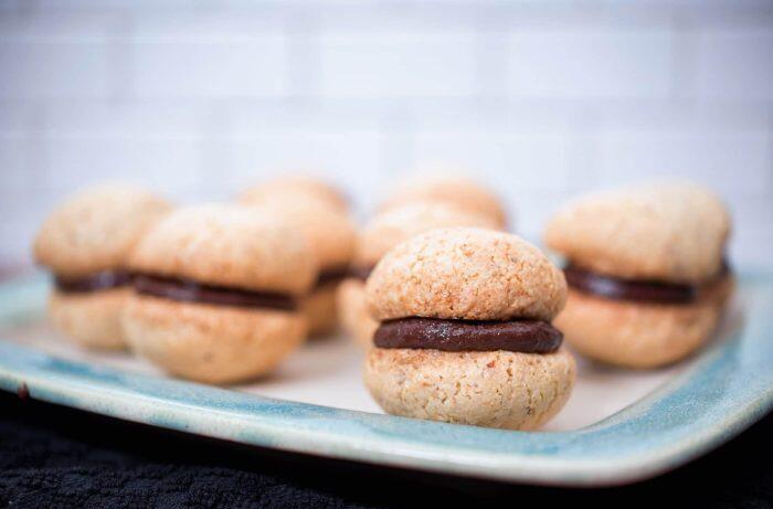 - Die Kuvertüre klein hacken, im Wasserbad schmelzen und die Sahne unterrühren. Die Hälfte der abgekühlten Plätzchen auf der Unterseite bestreichen und mit einer anderen Hälfte zusammensetzen. Gut auskühlen lassen.