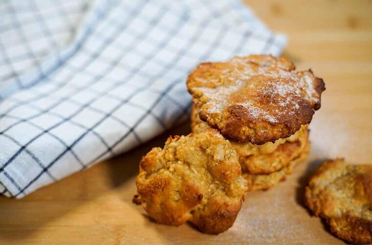 Im nächsten Schritt kommen noch die Apfelstücke zum Teig. Der Teig sollte sich relativ feucht und klebrig anfühlen. Forme die Masse dann zu Ballen und lege sie auf ein Blech mit Backpapier.