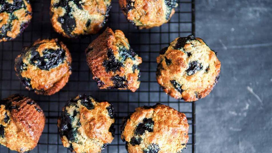 - Mehl, Backpulver, Zucker und Salz in einer separaten Schüssel mischen und anschließend unter die Butter-Ei-Masse rühren. Zuletzt die Blaubeeren vorsichtig mit einem Teichschaber unterheben.