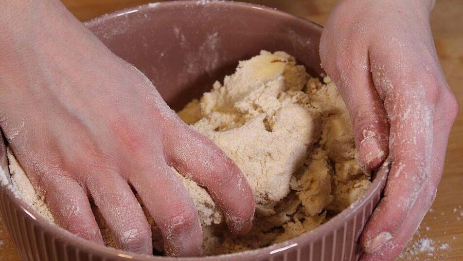 Nach und nach das Wasser und das Olivenöl zu den trockenen Zutaten geben. Dabei entweder mit einem Kochlöffel oder direkt mit den Händen arbeiten, bis ein glatter und geschmeidiger Teig entsteht. Falls der Teig zu klebrig ist, einfach ein wenig Mehl hinzufügen.