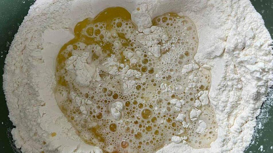 Das Mehl mit 4 Esslöffeln Olivenöl, den Eigelben, Salz und dem lauwarmen Wasser zu einem glatten Teig kneten.