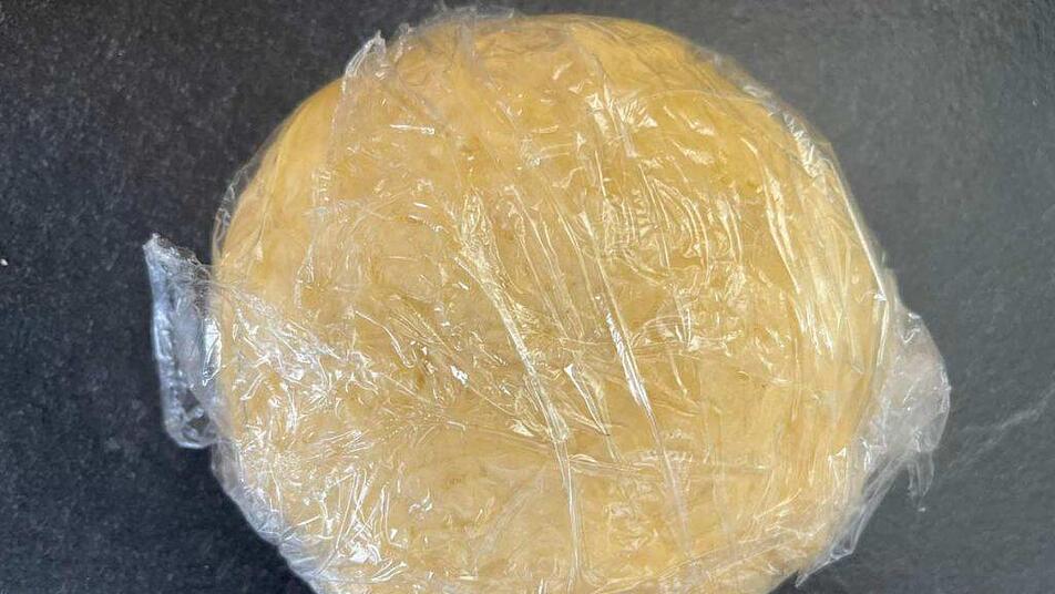 Den Teig mit einem Esslöffel Olivenöl bestreichen und in Frischhaltefolie wickeln. Bei Zimmertemperatur etwa 30 Minuten ruhen lassen.