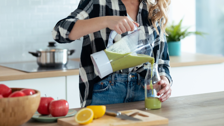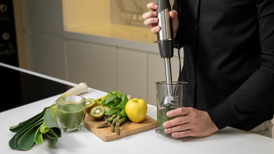 Bevor du dir direkt einen Entsafter zulegst, kannst du deine Säfte zunächst auch ganz unkompliziert mit einem Pürierstab selbst herstellen. Foto: Adobe Stock | Sergey