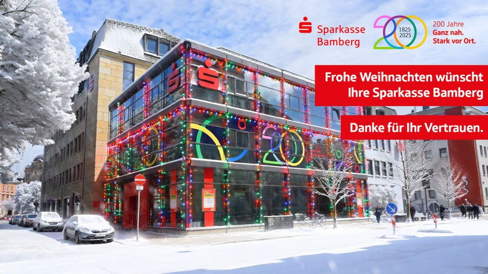 Wir wünschen Ihnen und Ihren Familien ein frohes Fest, erholsame Feiertage und einen erfolgreichen Start ins neue Jahr. Begleiten Sie uns weiterhin auf unserer Reise und erleben Sie, was uns als Sparkasse Bamberg ausmacht: Nähe, Verantwortung und der feste Wille, auch in den nächsten 200 Jahren für Sie da zu sein.
