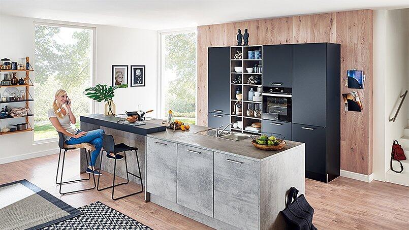 Generell bezeichnet der Industrial Style einen Mix aus klarer Linienführung, dunklen Farbtönen und Materialien, die bewusst an unbehandelte Baustoffe erinnern sollen. Im Küchenbereich eignen sich für den Stil also beispielsweise Fronten in grauer Beton- oder Stein-Optik besonders gut. Daraus entsteht eine kühle und schlichte Atmosphäre, die es Ihnen erlaubt, mithilfe von edlen Highlights wie Holz- oder Edelmetallelementen durchdachte Akzente zu setzen.