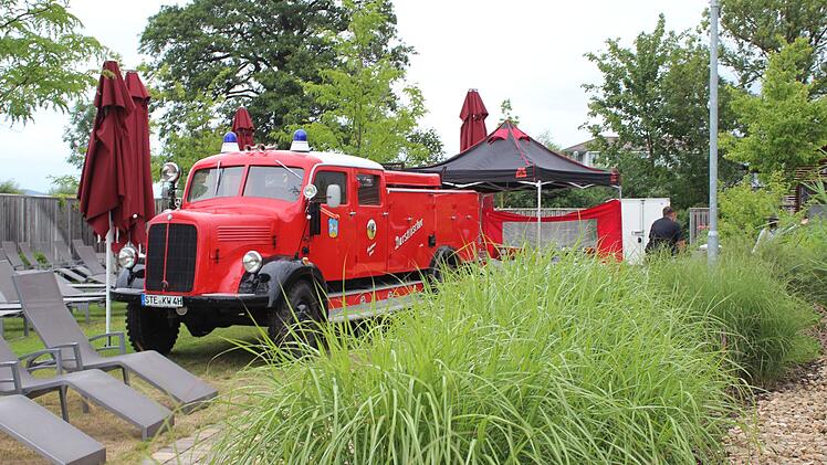 Ein echter Hingucker im SaunaLand: Beim historischen Feuerwehrfahrzeug bekommen durstige Gäste die richtige Erfrischung. Foto: Obermain Therme Bad Staffelstein