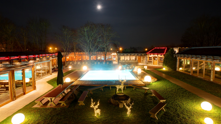 Unser Tipp: Bei Nacht ist der Saunagarten besonders schön, wenn der Außenbereich in warmes Licht getaucht ist. Die liebevollen Details und der angelegte Teich kommen dann noch besser zur Geltung.