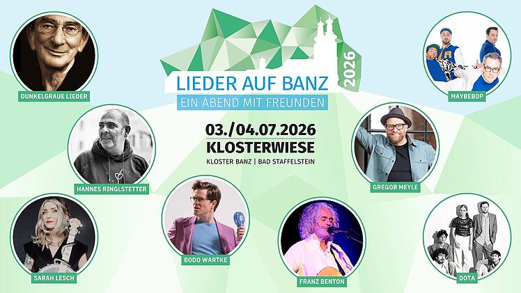 Lieder auf Banz findet am Freitag, 03.07.2026, und am Samstag, 04.07.2026, um 19 Uhr auf der Klosterwiese in Bad Staffelstein statt.