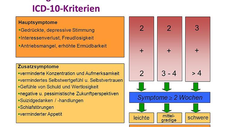 Die Kriterien der ICD-10 helfen abzuschätzen, ob jemand an einer depressiven Episode leidet und welcher Schweregrad vorliegt. Ein Beispiel: Eine leichte Depression liegt vor, wenn der Betroffene zwei der drei Hauptsymptome und zwei der sieben Zusatzsymptome zeigt.