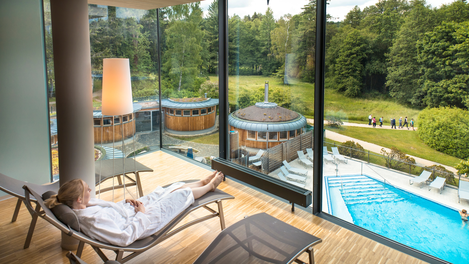 Die Saunalandschaft im Kurpark lässt nichts zu wünschen übrig. Im Innenbereich erwarten dich ein Dampfbad (45°C), ein Eisbrunnen, ein Tepidarium (60°C) und eine finnische Sauna (80°C). Das Saunadorf im Außenbereich verzaubert dank der lichtdurchfluteten Atmosphäre und des eindrucksvollen Blicks ins Grüne.