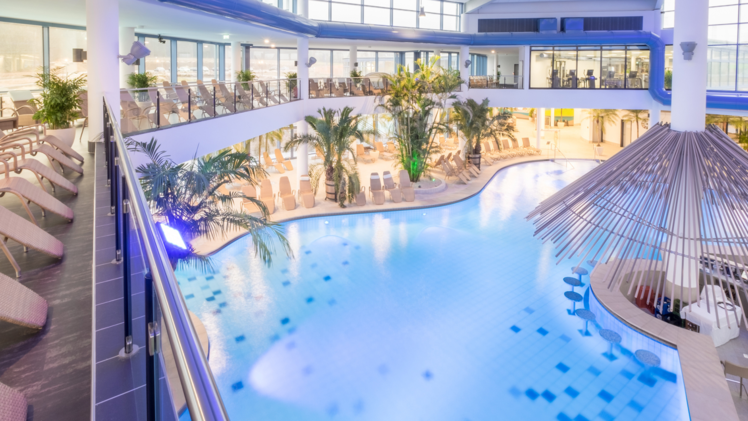 Ein Strömungskanal mit Lagune und Wasserfall verbindet Aktivbecken mit dem Thermal-Verwöhnbecken, in dem man auf Champagnerliegen das warme Nass genießt. Einen erfrischenden Drink können sich Besucherinnen und Besucher an der Poolbar genehmigen. Das direkt angeschlossene Außenbecken verfügt ebenfalls über Sitz- und Liegemöglichkeiten im Wasser sowie über Massagedüsen und Schwanenhälse.