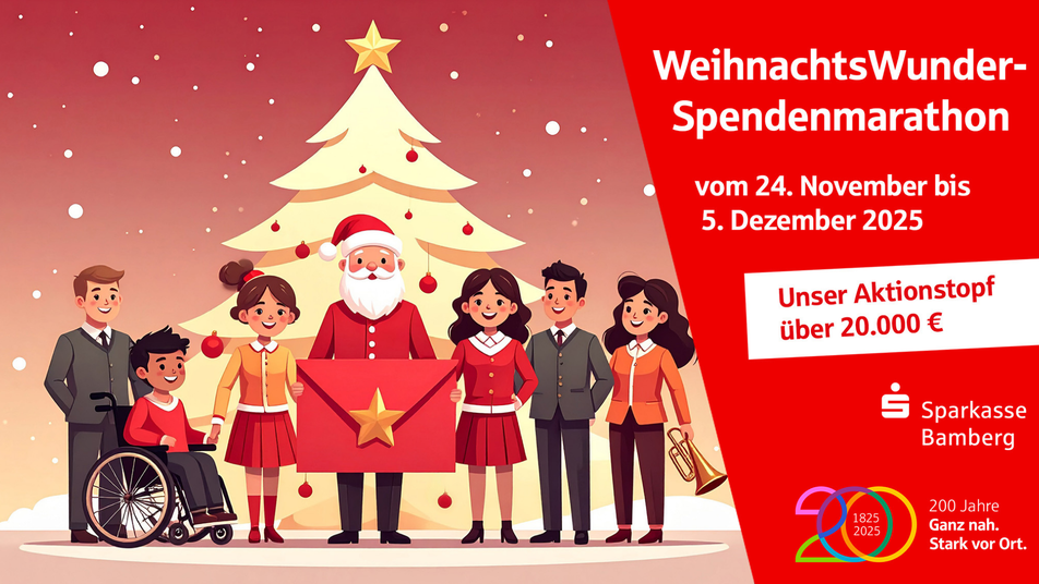 Gemeinsam mit dir möchte die Sparkasse Bamberg mit Hilfe von regionalen Vereinen gemeinnützigen Zwecken eine Freude zu Weihnachten bescheren. Hierfür wurde derWeihnachtsWunder-Spendenmarathon ins Leben gerufen. Passend zum 200-jährigen Jubiläum steht hierfür ein Aktionsbudget von 20.000 Euro bereit - und somit 10.000 Euro mehr gegenüber der Voraktion! Vereine können sich durch Spenden ihren Anteil am Aktionstopf sichern. Je größer der Anteil, desto größer das Stück vom Kuchen!