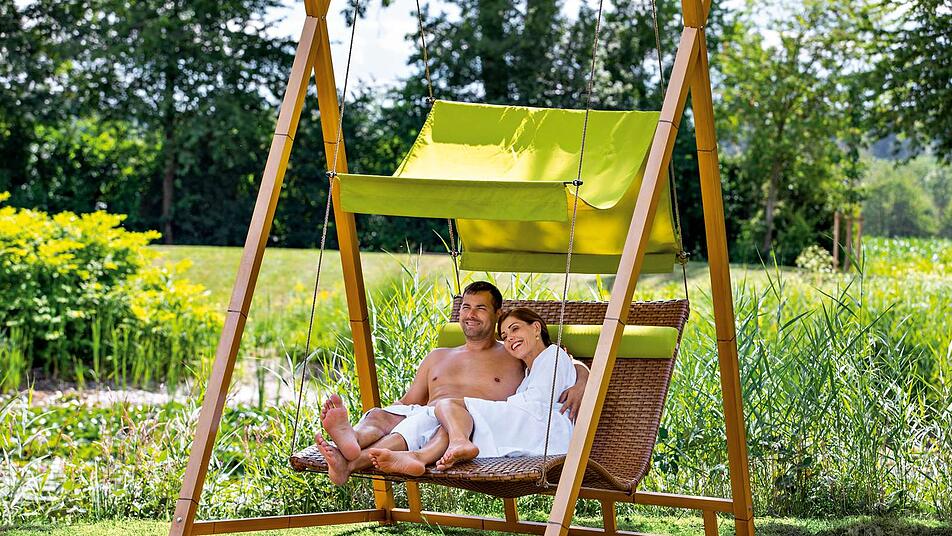 Auch im Herzen dieser Wellnesslandschaft ist für zahlreiche Plätze im Sonnenschein gesorgt. Besonders beliebt sind die Hängeliegen im großzügig angelegten Saunagarten. Das leichte Schaukeln unter freiem Himmel sorgt für absolute Entspannung an der frischen Luft zwischen den Saunagängen. Selbst am Abend lassen sich hier noch die letzten Strahlen der Sonne einfangen. Was gibt es Schöneres für Sonnenhungrige?