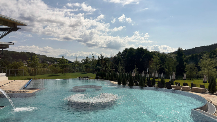 Seit letztem Jahr gibt es ein rund 260 Quadratmeter großes Außenbecken, das mit Sprudelliegen, Massagedüsen und einer Schwallduschen ausgestattet ist und luxuriöse Entspannung verspricht. Bei passendem Wetter lässt es sich auf der Terrasse mit Liegen und Sonnenschirm oder der weitläufigen Liegewiese gut aushalten.